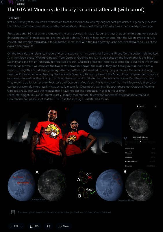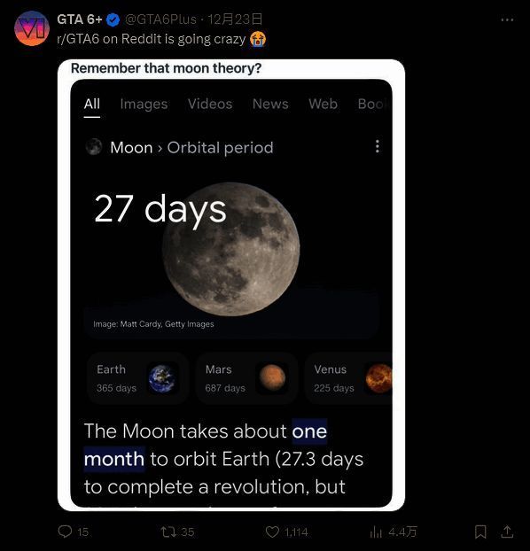这只是巧合?有人可不这么认为。这些粉丝预测,新预告会在“亏凸月”那一天发布,因为第一部预告发布日 2023 年 12 月 1 日也是“亏凸月”,而且《GTAOL》中的一次更新也将游戏内的月亮改为了这种月相。