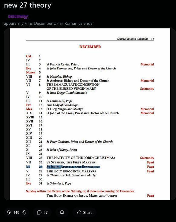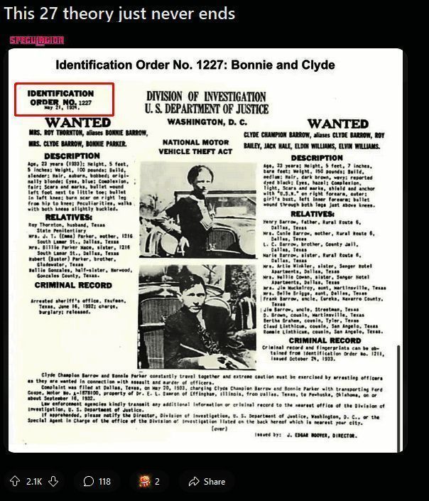 还有学术化的理论使用罗马日历算出 12 月的“VI”就是 12 月 27 日,这天还被称为“圣约翰、使徒和福音传教士盛宴”。另一方面,新作主角的灵感来源“雌雄大盗”现实中的罪犯识别号就是“1227”。