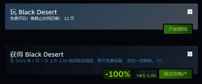 近日,韩国开发商Pearl Abyss开发的MMORPG《黑色沙漠》再次在Steam上开启了限时免费活动,截止到北京时间2025年1月7日凌晨2点,玩家可以直接免费领取入库,不过该作锁Steam国区,国区账号无法直接领取。