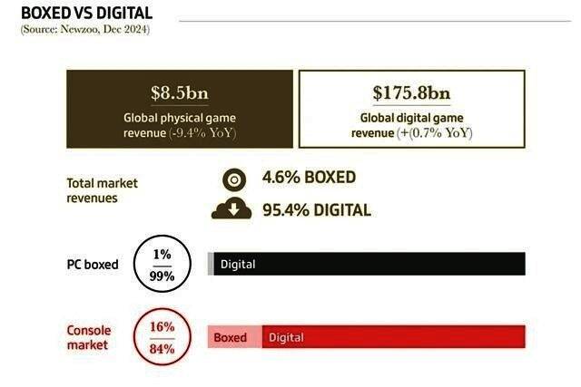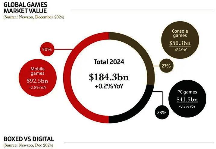 其中移动端游戏占据了市场的一半,剩余部分由主机和PC游戏分摊。主机游戏销售额下降了4%,PC游戏略降0.2%,而移动端游戏则实现了2.8%的增长。