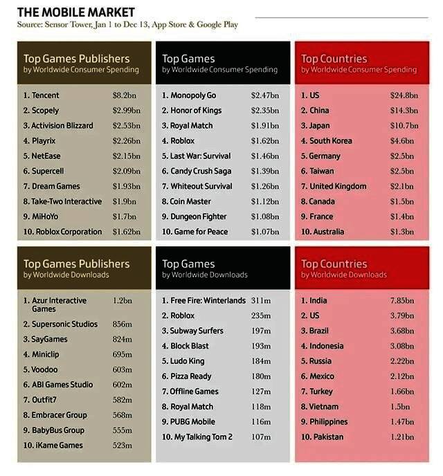 在移动游戏领域,美国和中国是主要市场。据估计,在下载量上,印度和美国位居前两位。腾讯是最大的移动游戏销售商,紧随其后的是Scopely及其热门游戏《Monopoly Go》,动视《糖果传奇》和《使命召唤》移动版也表现优异。