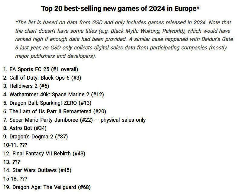媒体GamesIndustry.biz主编Christopher Dring在最新一期GI Microcast节目中分享了2024年欧洲游戏销量榜,同时指出整个2024年欧洲地区新游戏的销量比去年下降了23%,而《龙腾世纪:影障守护者》未挤进Top 50。