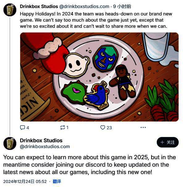 12月24日,《无名小卒拯救世界》开发商DrinkBox Studios在其最新社交媒体贴文中透露,该团队的全新作品目前正在开发中,不过关于这款游戏的更多信息暂时还无透露,玩家们可以期待在2025年了解该作的更多信息。