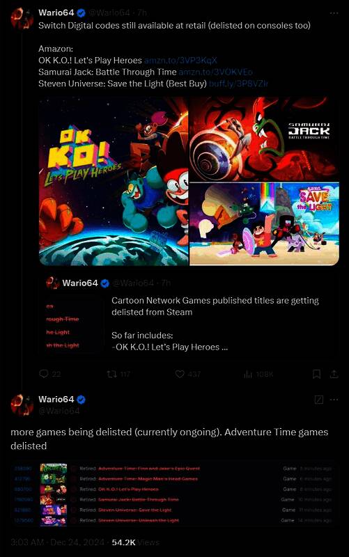 名为“Wario64”的推特用户最新发现该情况,从他的推文中可以看到,华纳已将《探险活宝:芬恩和杰克的史诗任务》、《探险活宝:魔术师的头脑游戏》、《武士杰克:时空之战》、《OK KO!让我们扮演英雄》、《宇宙小子:拯救光明》和《宇宙小子:释放光明》这几款游戏在PC及主机平台下架,目前这几款游戏的Steam页面也都显示停售而无法购买(但有3款游戏的Switch数字版仍可在零售平台购买到)。