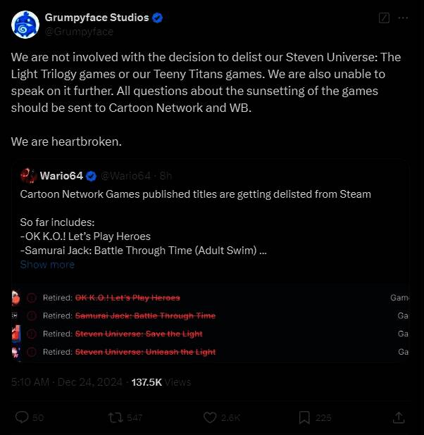 对此华纳兄弟官方并未做出进一步解释,而被下架游戏的开发公司之一则在推特上表示:“我们并没有参与下架《宇宙小子:光明三部曲》游戏或《少年泰坦》游戏的决定,我们也无法就此发表更多言论。有关游戏下架的所有问题都应发送给卡通频道和华纳兄弟。我们非常伤心。”