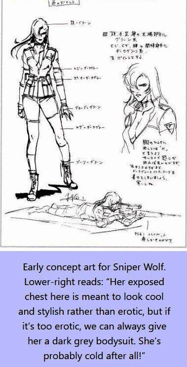 小岛秀夫说:“我想要的角色,仅仅从服装上就能看出他们是什么样的人,有什么样的动机”。在采访中,他还展示了狙击雪狼的早期概念图,并称图中露出的胸部是为了看起来很酷很时尚,而不是色情。