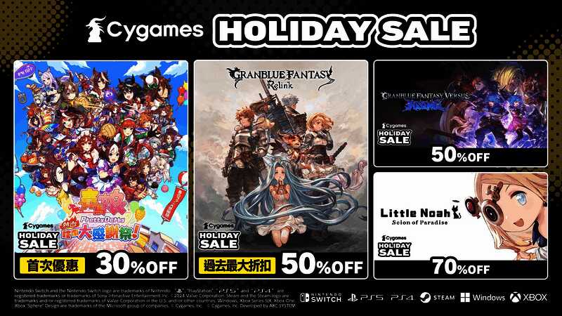 关于各游戏的优惠期间及详情,请至「Cygames Holiday Sale」活动专页中确认。