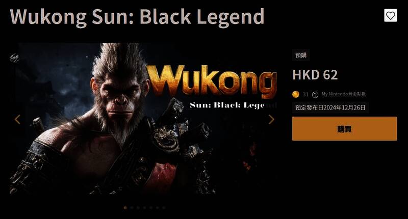 Switch eShop商店页面显示,《悟空传:黑暗传奇》是一款横版动作游戏,开发商为globalgamestudio,售价62港币,预计2024年12月26日发售,下载大小仅338MB,支持英文。