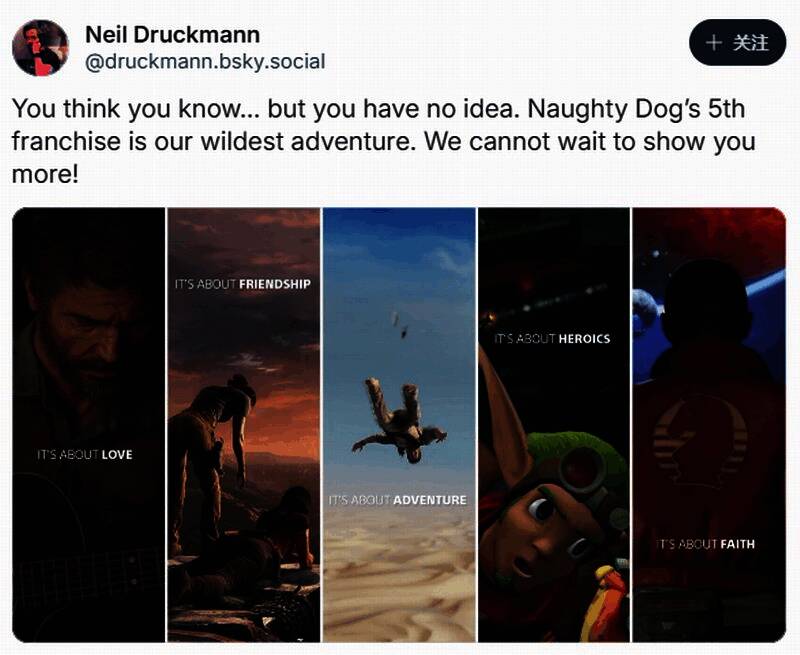 顽皮狗新作《星际:异端先知》女主因为形象问题,在网上饱受争议。近日尼尔·德拉柯曼(Neil Druckmann)在Blue Sky发文称,该作将是顽皮狗最疯狂的冒险。