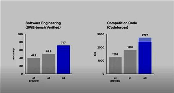 评估显示,o3在软件工程测试中准确率比o1高近47%,竞赛数学测评的准确率比o1高15%,人类博士专家级生化物测试中准确率比o1高近13%。