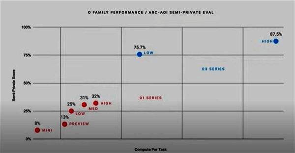 对比之下,GPT-3的评测结果为0%,GPT-4o为5%,而o3一举将成绩提升到87.5%。