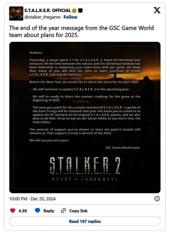 GSC Game World 以推出《潜行者2:切尔诺贝利之心》7.6G重大补丁来为今年的工作收尾,关于未来的细节将于不久后公布。除了重申这款开放世界射击游戏将持续更新外,官方表示将在2025年初公布游戏的内容路线图。