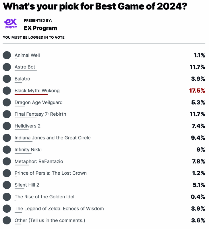 IGN编辑认为以《女神异闻录》为基准的《暗喻幻想》达到了一个新的高度,创造了一个奇幻的世界。值得一提的是《黑神话:悟空》当前以17.5%的得票率位居玩家投票榜首。而年度游戏《暗喻幻想》仅为7.8%的投票率。