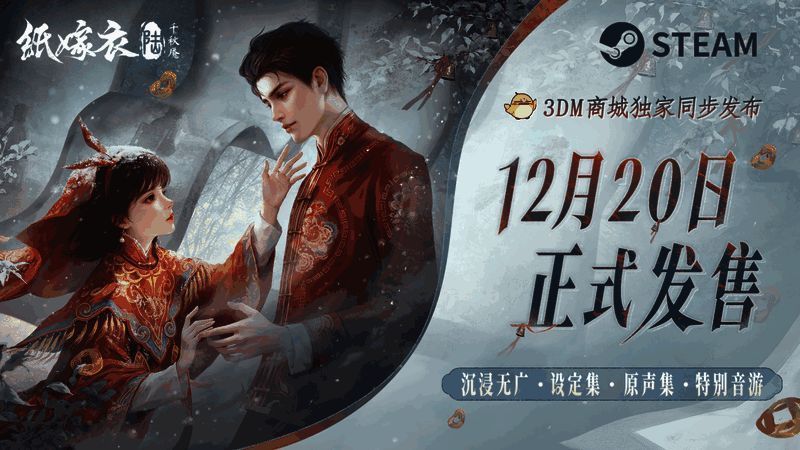 由国内著名游戏工作室心动互娱开发的中式恐怖剧情解谜游戏系列第六作《纸嫁衣6千秋魇》PC版,于今日(12月20日)于Steam上正式发售。本作一如既往采用买断制收费,Steam国区商店定价32元,首发折扣-10%,仅售28.8元,3DM商城也将会以28.8元的优惠价,独家同步发布本作。