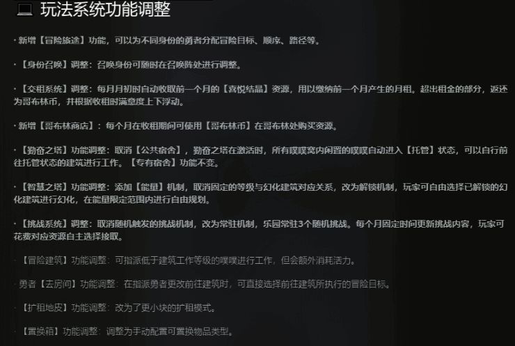 本次更新改善了游戏的核心机制,改掉了之前勇者随机完成任务从而造成资源倾斜的问题,现在可以根据乐园的情况灵活分配任务,经营乐园更得心应手。除此之外,召唤勇者、交租、乐园满意度等方面都进行了调整。