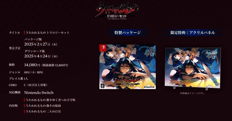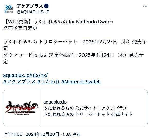 12月20日,发行商AQUAPLUS宣布《传颂之物》三部曲Switch版(日服)将延期发售,这包含了《传颂之物》系列的三部作品:《传颂之物:给逝者的摇篮曲》、《传颂之物:虚伪的假面》、《传颂之物:二人的白皇》,实体版由原定的2025年1月30日延期到2025年2月27日,三部曲数字版和单独作品(实体版和数字版)由原定的2025年3月27日延期到2025年4月24日。