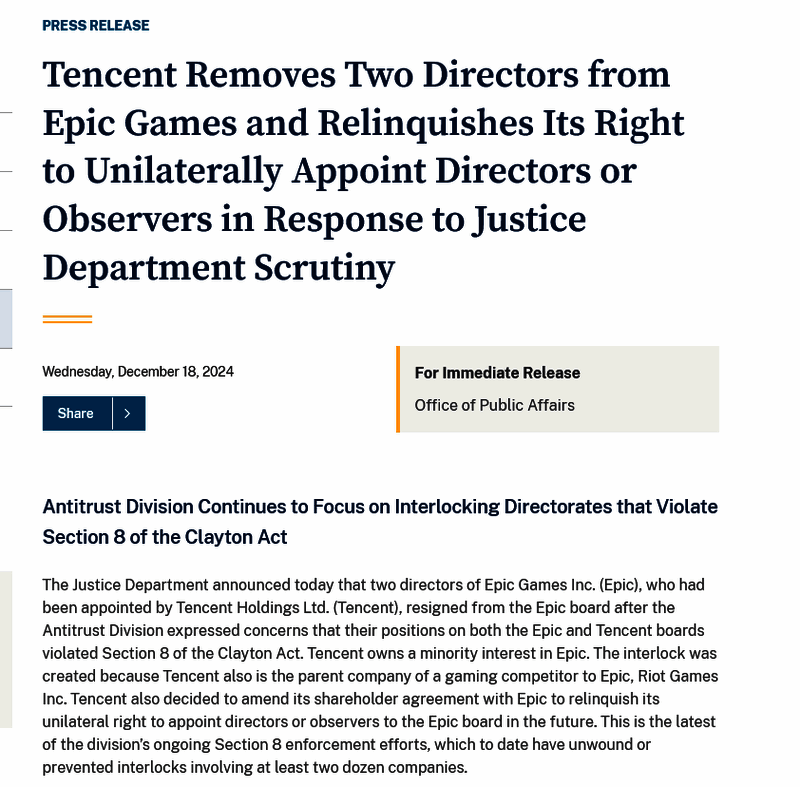 这实际上是指腾讯旗下的另一家公司 Riot Games 拳头游戏(《英雄联盟》《无畏契约》开发商),这些董事和高管不能同时在 Riot 和 Epic 的董事会任职。在司法部看来,Epic和 Riot 在业务上的重合使得它们成为了市场竞争对手,而腾讯拥有 Epic 少数股权(40%),并且是 Riot 的母公司(100% 股份)。