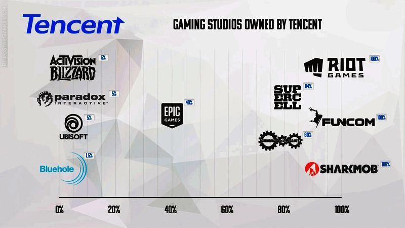 在股权投资方面,腾讯目前已经成为了全球最大的游戏公司,最近还传闻将收购育碧,但由于双方无法达成协议已推迟计划。此外,在与索尼昨日(12月 19 日)达成协议之前,腾讯曾是日本大型文化娱乐公司角川的最大股东,该公司是著名游戏工作室 FromSoftware 的母公司。公司还拥有最近推出的热门 ARPG《流放之路2》开发商 Grinding Gear Games 的 80% 股份,以及动视暴雪的 5% 股份。