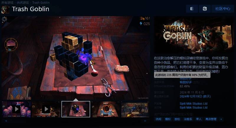 由Spilt Milk Studios Ltd打造的休闲经营模拟游戏《变废为宝哥布林》,已在今年的11月6日以抢先体验形式于Steam平台推出,并收获了总体好评率为88%的特别好评。