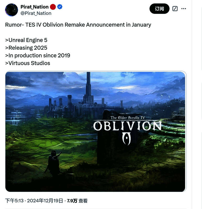 《上古卷轴4:湮没》重制版由维塔士工作室负责,采用虚幻5引擎,重制版从2019年就开始了,计划在2025年发售。