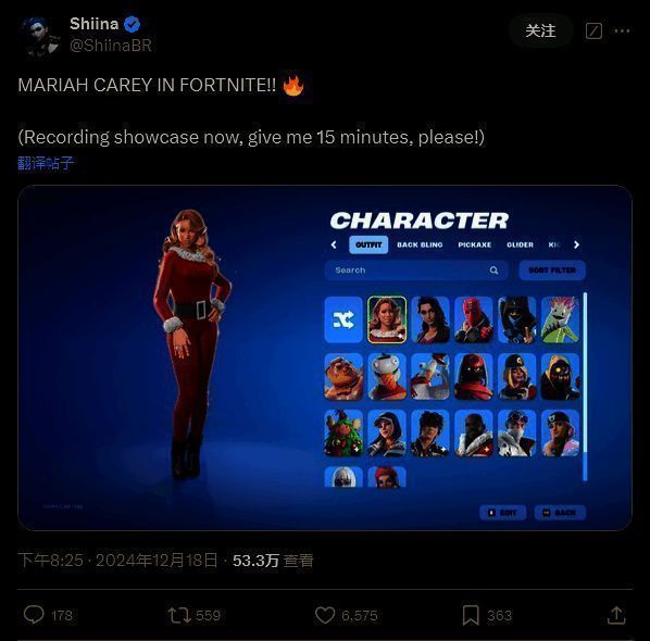 而游戏界跨界联动能力最强的游戏《堡垒之夜》今年圣诞就将把“那个女人”带到游戏当中。根据《堡垒之夜》长期的泄露社交媒体账号 Shiina,玛丽亚·凯莉即将作为可替换的皮肤在游戏的冬季节日互动活动加入游戏。