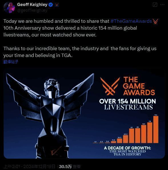 今日(12月19日),TGA创始人Geoff Keighley发文宣布TGA 10周年直播观看人创下TGA历史最高观看记录,全球约1.54亿观众收看本次直播。