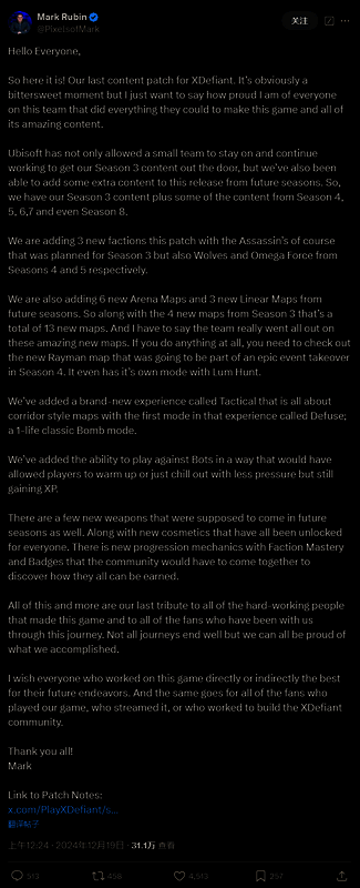 总监在推特上发帖解释道:“育碧不仅允许一个小团队留下来并继续努力推出我们的第 3 赛季内容,而且我们现在还能将未来版本中的额外内容加入游戏。