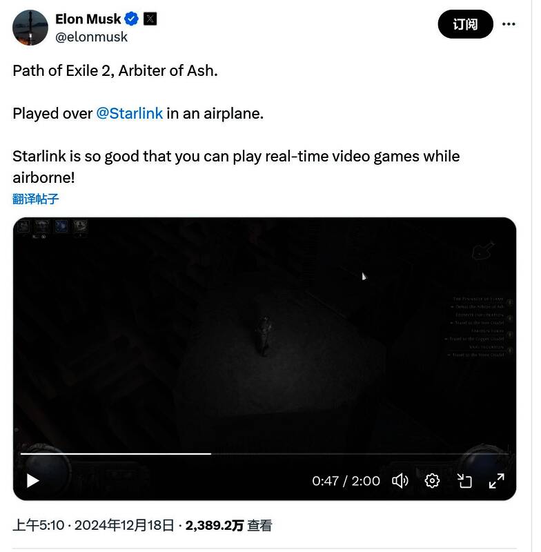 近日,埃隆·马斯克在他旗下社交平台X(原Twitter)上分享了一段令人兴奋的视频,展示了他在飞机上通过星链(Starlink)卫星互联网畅玩《流放之路2》的画面。