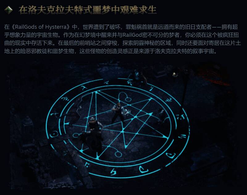 故事讲述整个世界遭受拥有无尽力量的宇宙生物「旧日支配者」摧毁,自梦境国度甦醒的玩家,将利用名为「RailGod」的怪物火车探索邪教徒、梦魇生物肆虐的阴郁神祕大地,于不同的哨口间四处穿梭,试图在已然疯狂扭曲的现实中生存。