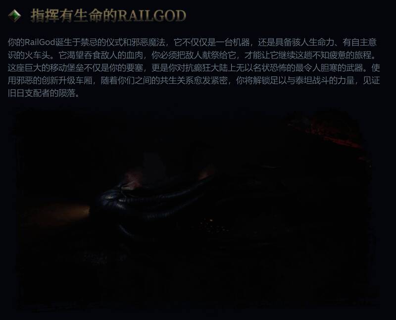「RailGod」诞生自禁忌仪式与不洁魔法,是个具有感知能力且渴望血肉的火车头,玩家将以此做为据点,透过进行献祭培养与火车的共生连结,获得驾驭管理、探索及禁制的技能,逐步解锁足以与泰坦抗衡的黑暗力量。