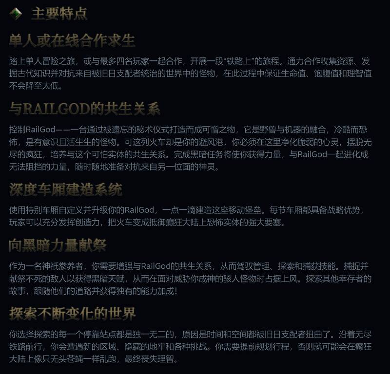 官方表示,游戏可单人游玩,也可与最多四名玩家线上组队游玩,玩家在合作收集资源、揭开古老知识并对抗怪物时,务必随时留意生命值、饥饿值及神智。游戏中的车厢建造系统提供玩家升级与客制化「RailGod」的外观,打造独属于自己的风格。此外,透过探索其余幸存者的故事,玩家将获得独特技能。