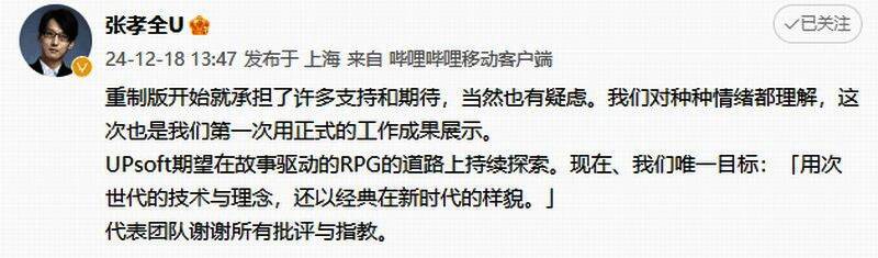 之后游戏制作人张孝全在微博上发文称:“重制版开始就承担了许多支持和期待,当然也有疑虑。这次也是我们第一次正式的工作成果展示。UPsoft期望在故事驱动的RPG的道路上持续探索。现在我们唯一目标是用次世代的技术与理念,还以经典在新时代的样貌!”