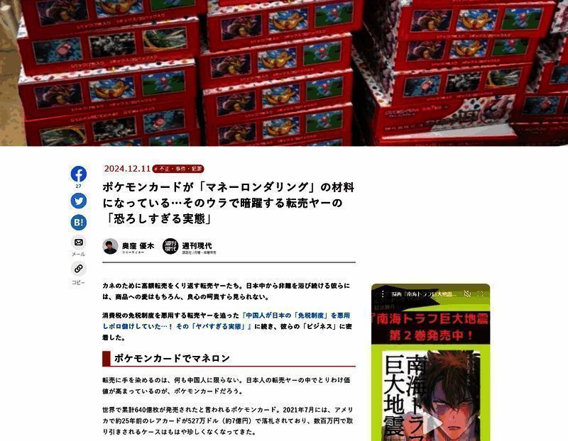 根据日本媒体《周刊现代》的一份最新报道,包括银行诈骗者在内的许多犯罪分子正在使用宝可梦 TCG 实体卡牌来进行洗钱。文章中引用了一位前犯罪负责人的话称,,这些卡牌的尺寸较小,很容易隐藏,这为犯罪分子提供了可以将在藏狂转移至国外的简单方法。随后他们在海外出售这些卡牌,还能将利润兑换为外国货币。