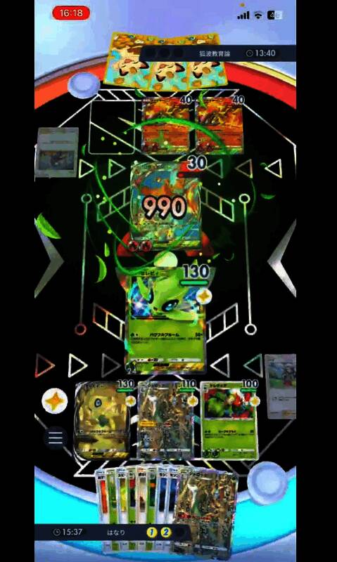 此外还有玩家在对战中获得了48个能量附加在时拉比身上,并用“强力绽放”技能成功掷出了28个正面。不过理应打出1440点伤害的技能,最终只打出了990点,看来设计师也没有预料到新卡牌可以突破游戏的伤害上线。
