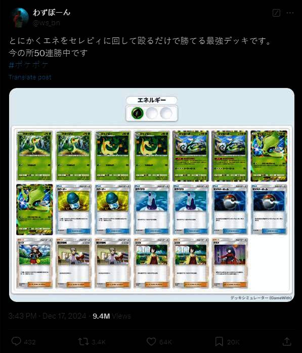 但随着新卡牌的登场,很快就有玩家发现部分新卡的强度超模到逆天,最主要的卡牌就是新登场的君主蛇,拥有只要在场上就能让草系宝可梦所附加的草能量翻倍的效果。而搭配上时拉比ex卡牌的“强力绽放”(使用技能时以时拉比身上的能量数量来投掷硬币,出现的正面次数X50则为打出的伤害)技能,可以打出惊人的伤害。