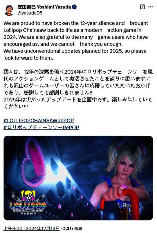 安田善已在贴文中说道:“我们很自豪能够打破12年的沉寂,在2024年让《电锯甜心》作为一款现代动作游戏重新焕发活力。我们也感谢众多鼓励我们的游戏用户,我们感激不尽。我们计划在2025年进行非常规更新,敬请期待。”