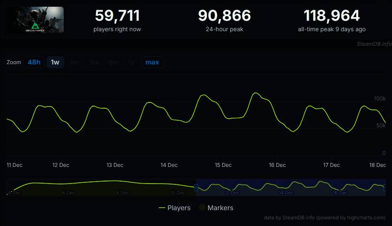 12月5日《三角洲行动》(Delta Force)在Steam和EPIC等平台开启全球公测。现在据SteamDB数据显示,《三角洲行动》Steam同时在线人数峰值达到118964人,表现相当不错。