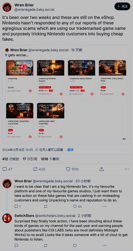 近日,《Unpacking》的创意总监 Wren Brier 在社交媒体上表达了对任天堂未处理“廉价山寨游戏”的不满。