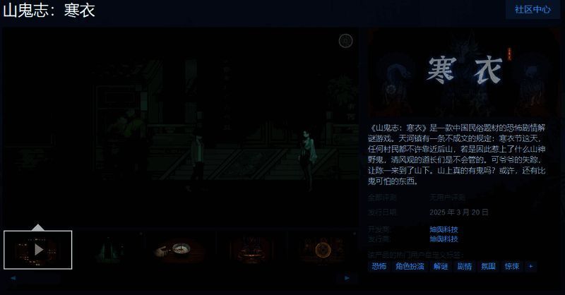 今日(12月17日),国产恐怖剧情解谜游戏《山鬼志:寒衣》Steam页面开放,2025年3月20日发售,感兴趣的玩家可以点击此处进入商店页面。
