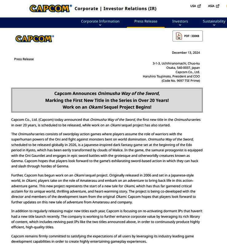 此外卡普空还强调:“该公司正致力于利用其丰富的内容库来进一步提升企业价值,其中包括复活《大神》和《鬼武者》等过去的IP,以便不断推出高效、高质量的作品。”