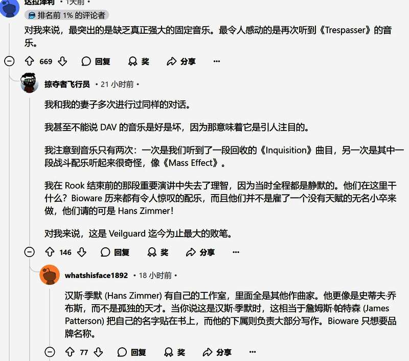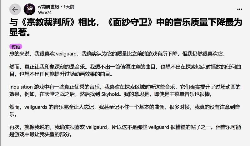 Reddit用户Wire74表示:“《龙腾世纪:审判》有一些确实非常优秀的音乐,我喜欢在探索区域时听,它们确实提升了过场动画的品质。而《影障守护者》的音乐则完全让人忘记,我甚至记不住一首基本的曲子。很多时候,我真的没有注意到音乐。”