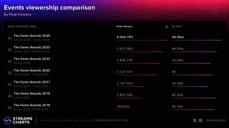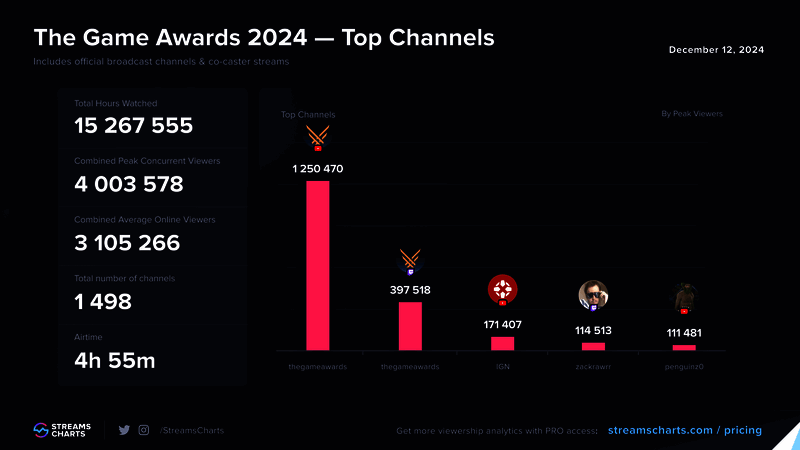 根据Streams Charts的数据显示,2024年TGA全平台同时在线观看人数的峰值突破了400万大关,最高同时观看人数为4,003,578名观众,这些观众分布在多个直播频道,TGA官方YouTube直播频道峰值数据为1,250,470名观众,Twitch直播频道为397,518名观众,Asmongold和MoistCr1tikal等热门主播在共同直播该活动时也创下了超过10万名观众的峰值数据。