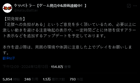 ·官方回应称,已经收到了玩家的关于足腰疲劳损伤的反馈,将很快发布新更新,加入关于适度游戏谨防损害足腰的游戏中提示,而且提醒玩家注意游戏时的周围环境妨碍。
