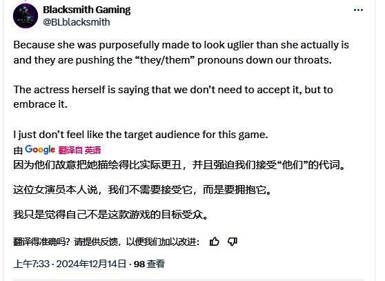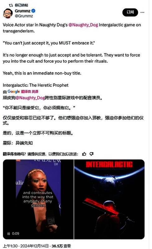 反woke推主Grummz挖出《星际:异端先知》配音演员Tati Gabrielle曾公开表达过她自己对跨性别的看法,她说:“你不仅仅是接受它,你必须拥抱它。”