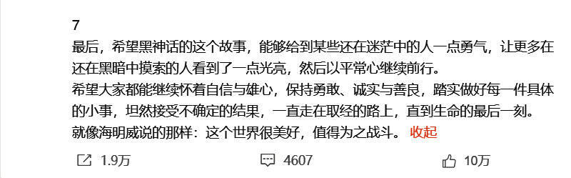 最后,希望黑神话的这个故事,能够给到某些还在迷茫中的人一点勇气,让更多在还在黑暗中摸索的人看到了一点光亮,然后以平常心继续前行。