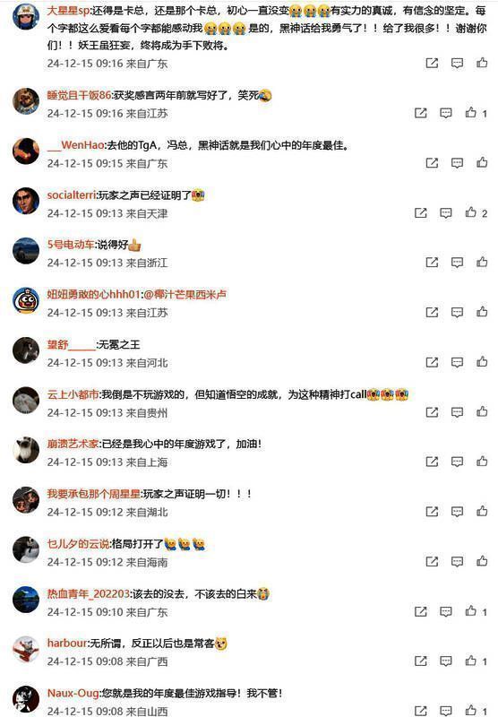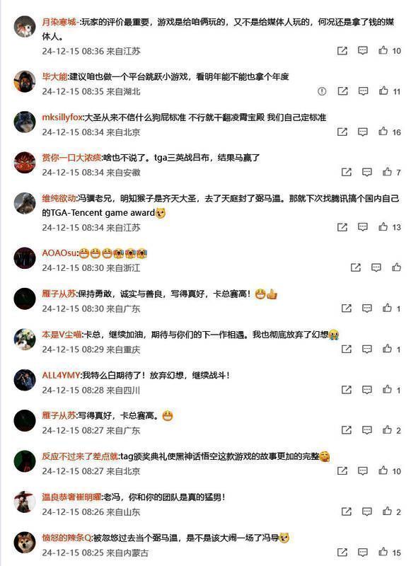 TGA颁奖刚过去一天,《黑神话》开发商游戏科学创始人兼CEO冯骥刚刚在微博上发声,说了一些没能在颁奖舞台上说的话,也算是首次就《黑神话:悟空》落选2024年TGA年度游戏做出了个人回应。