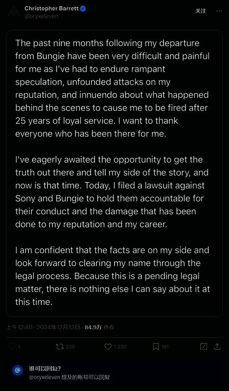 他感谢了支持自己的人,并继续写道:“我一直在热切等待了解真相并讲述我这一面故事的机会,现在就是时候了。今天,我对索尼和 Bungie 提起了诉讼,要求他们对自己的行为,以及对我的声誉和职业生涯造成的损害承担责任。”