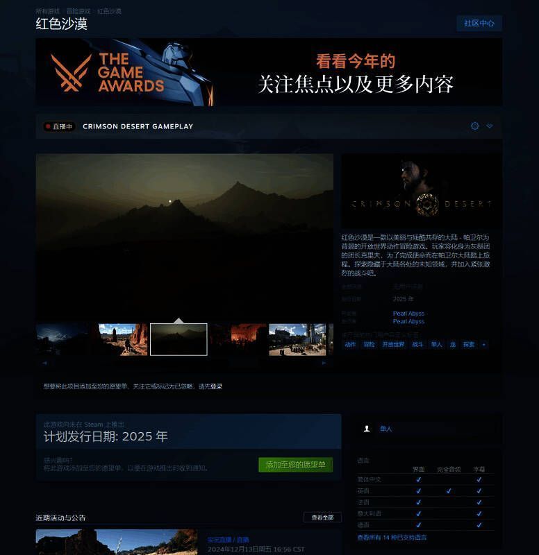 在TGA 2024上,开发商和发行商Pearl Abyss公布了《红色沙漠》的发售窗口——2025年秋季,同时公布了游戏的PC配置要求。《红色沙漠》一开始是一个大型在线游戏,后转成了开放世界动作/冒险游戏,目前定于2025年秋季发售,登陆PC(Steam、Mac),PS5,Xbox Series X|S。游戏采用次世代BlackSpace引擎开发,支持简体中文。