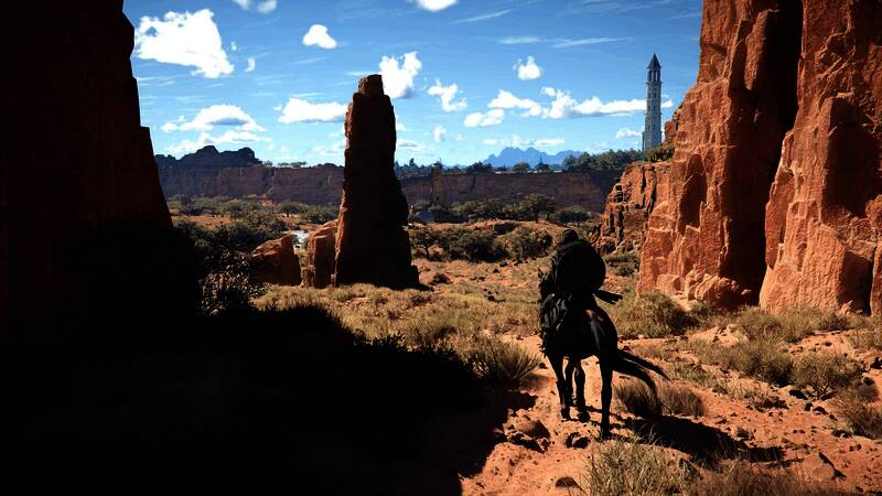 场景方面可看到有夜晚星空、未知神秘空间「Abyss」,及由空中滑翔至大地时能俯瞰多种地形与景色,显示《红色沙漠》中存在多样冒险。对此,官方表示,透过珍艾碧丝独家研发次世代游戏引擎「BlackSpace Engine」打造的生动环境,玩家可观察到在不同时间、天气 下的细致变化,带给玩家如同探索真实世界般的沉浸感。