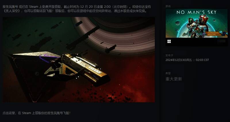 对此官方在Steam的更新公告中提到,该飞船领取的截止时间为12月20日凌晨2:00(北京时间),即使是尚未购买《无人深空》的玩家也可以领取这款飞船。而领取后,玩家可以在游戏中前往空间异常站,通过水银合成伙伴兑换。